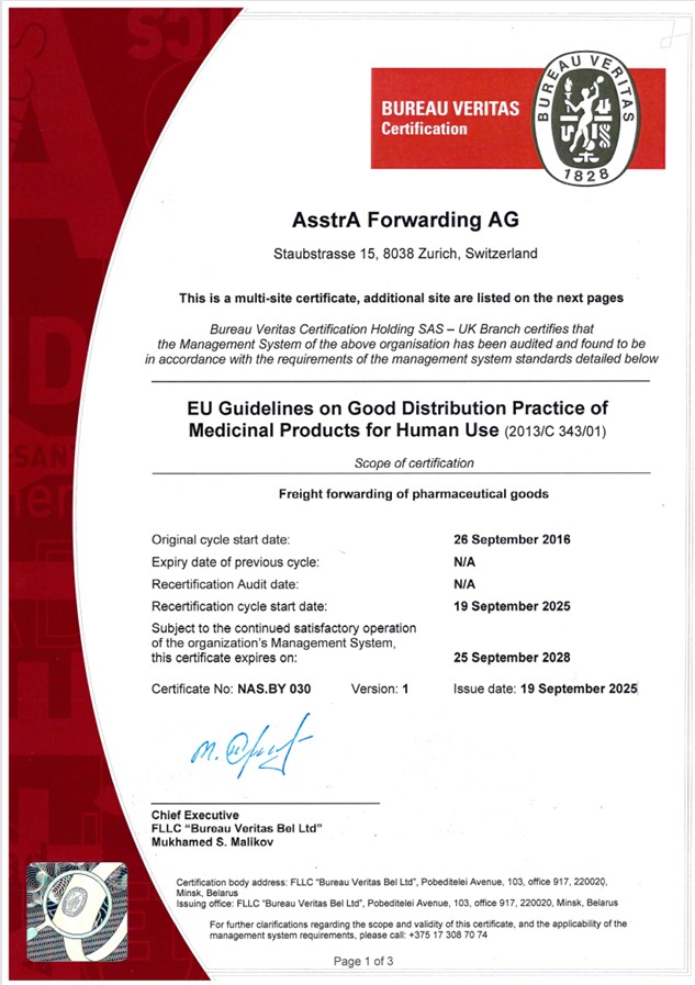 Сертификацията е извършена от сертифициращия орган Bureau Veritas, един от световните лидери в тестването, инспекцията и сертифицирането. Получаването на този сертификат е допълнителна гаранция за надеждно транспортиране на лекарства за Клиентите на AsstrA и потвърждава използването на най-новите технологии за контрол и трансфер на информация на всички етапи на транспортиране
